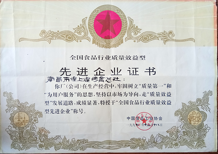 1997年,榮獲“全國食品行業(yè)質(zhì)量效益型先進(jìn)企業(yè)”稱號