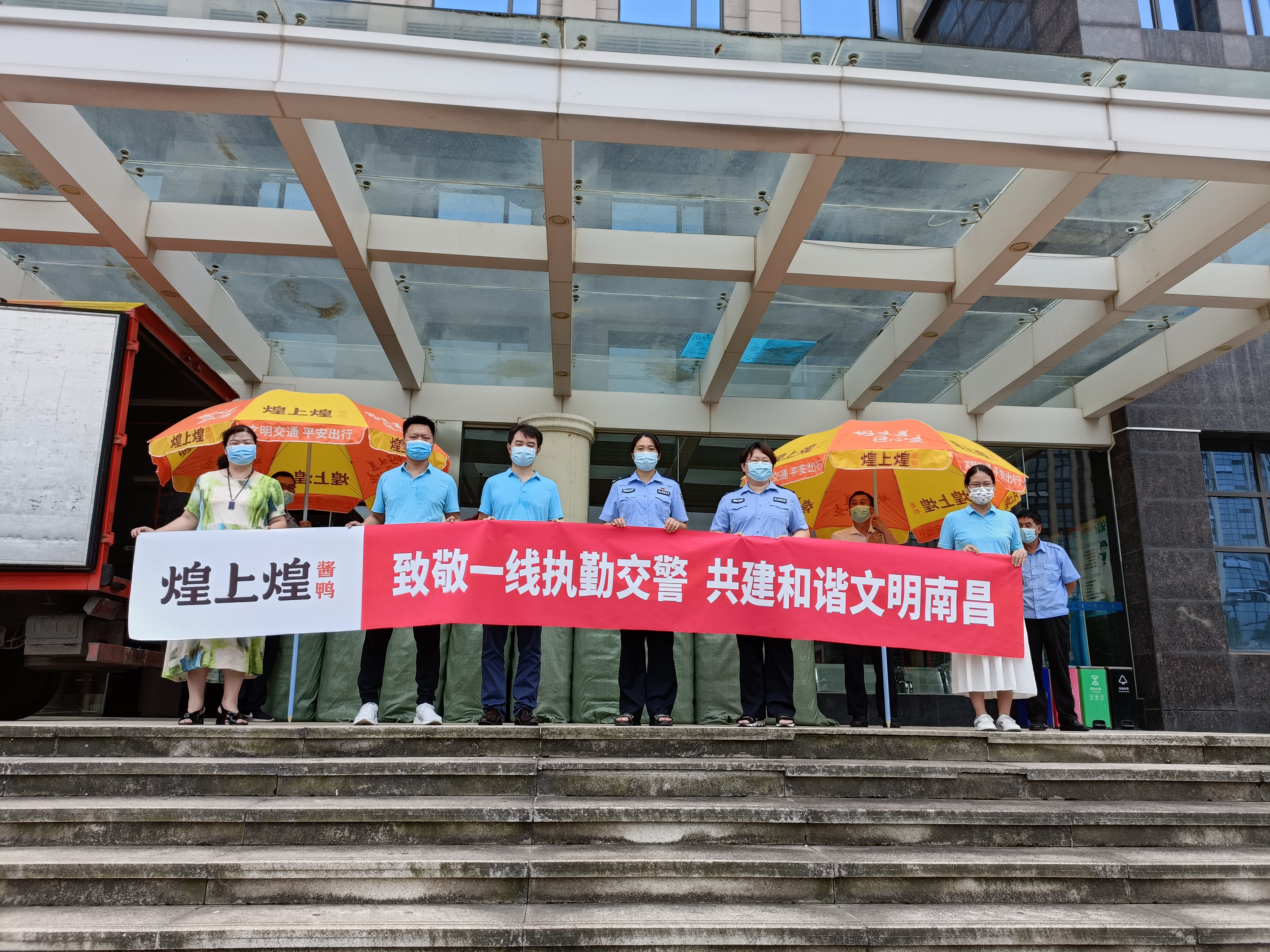 7月19日,煌上煌志愿隊(duì)來到南昌縣交警大隊(duì),向在惡劣天氣下奮戰(zhàn)執(zhí)勤的一線民輔警進(jìn)行慰問,并捐贈(zèng)遮陽傘。