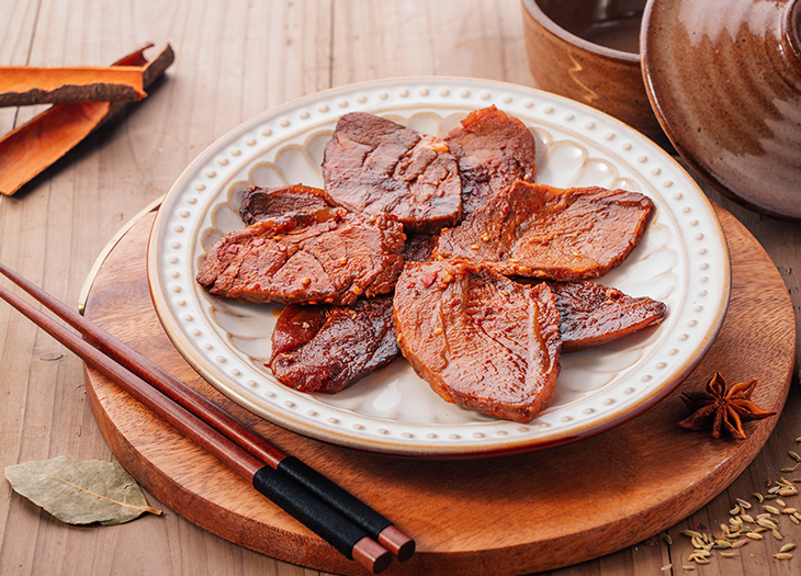 精選牛的肋排肉心,鹵制后切成薄片,拌入辣椒、蒜、姜等香辛料和調(diào)...
