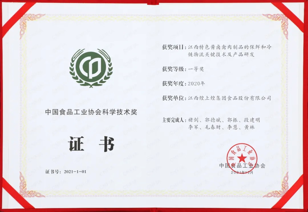 12月17-18日,以“科技·洞見未來”為主題的2021中國食品工業(yè)科技進步大會在鄭州召開,會上頒發(fā)了“中國食品工業(yè)協(xié)會科學技術獎”?;蜕匣统袚目蒲许椖俊敖魈厣u鹵禽肉制品的保鮮和冷鏈物流關鍵技術及其產品研發(fā)”獲得了中國食品工業(yè)協(xié)會科學技術獎一等獎,煌上煌股份公司副董事長褚劍被授予“全國食品工業(yè)科技創(chuàng)新領軍人物”榮譽稱號。